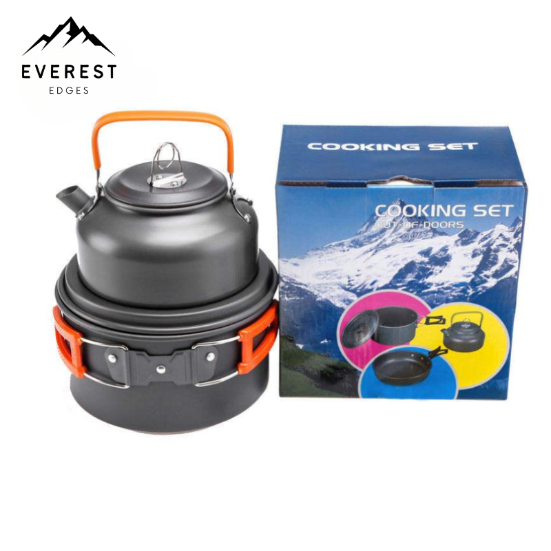 Ensemble Complet L’ensemble de bouilloire de camping comprend un kit complet de batterie de cuisine d’extérieur, comprenant une casserole, une poêle à frire, une théière, un réchaud, un verrou, une tasse d’eau en acier inoxydable, une cuillère, un couteau de table et une fourchette. Avec tout cet équipement à portée de main, vous serez prêt à préparer une grande variété de repas en plein air.